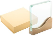 Skleněná trofej s podnoží z bukového dřeva. V kraftové dárkové krabičce.