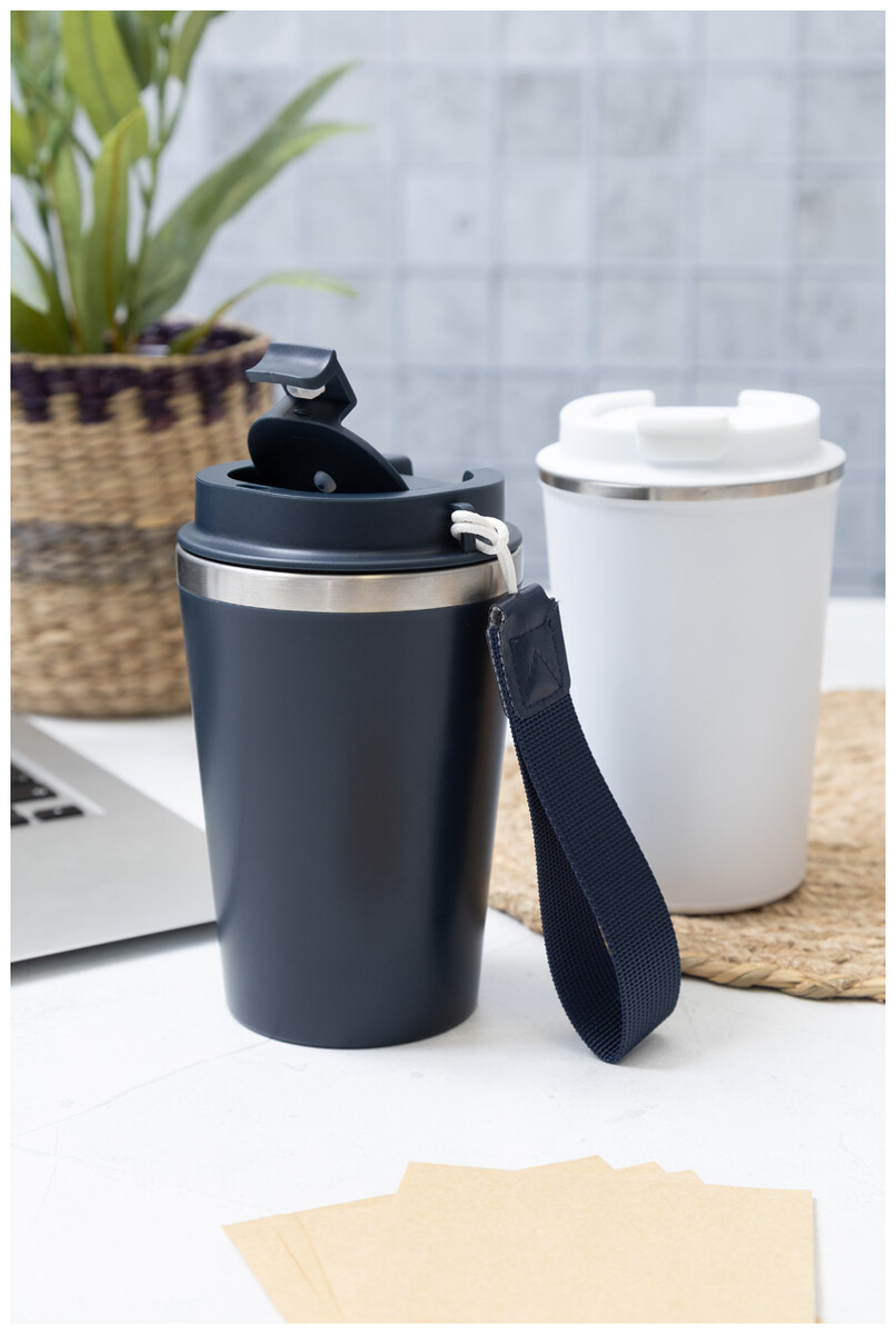 Dvoustěnný termo hrnek z recyklované nerezové oceli s vnějším PP plastem a víčkem na pití. S popruhem na přenášení RPET. 350 ml.