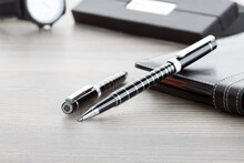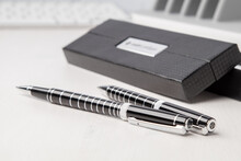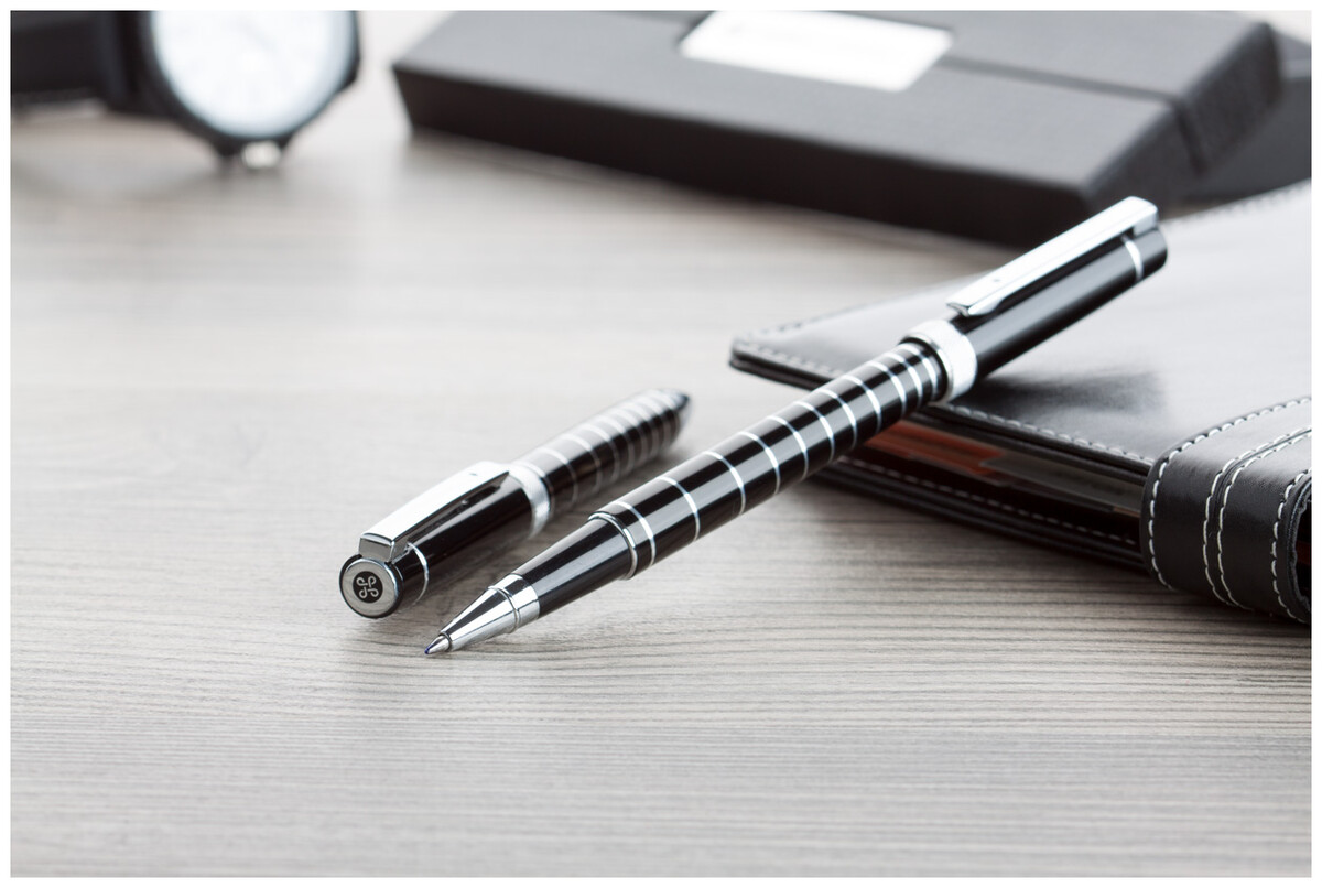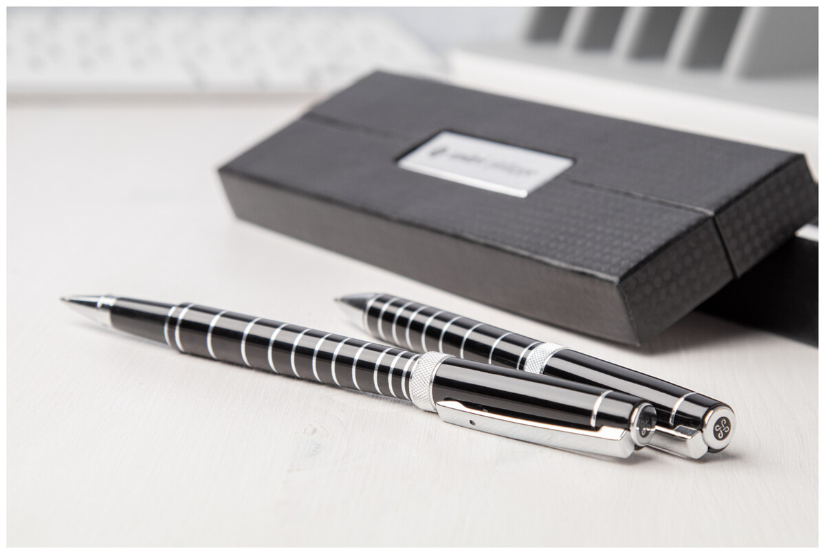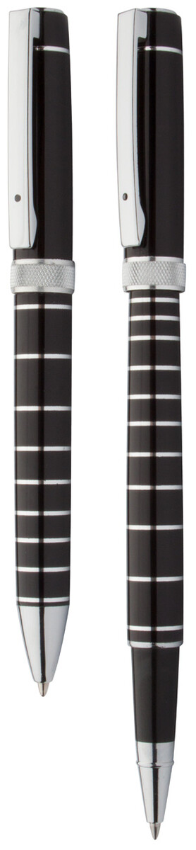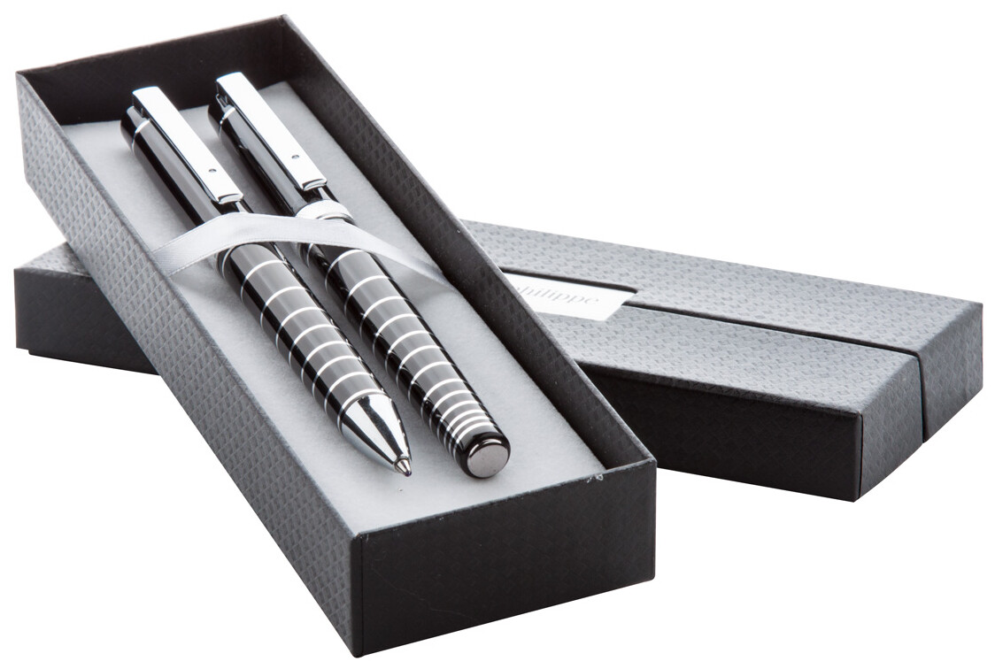 Elegantní hliníková sada per s kuličkovým perem a rollerem zn. André Philippe. Lesklý povrch s chromovanými kroužky. V černém dárkovém balení s modrou náplní.