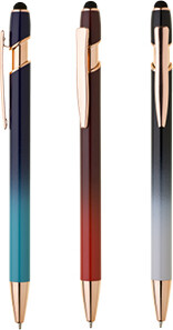 Elegantní kuličkové pero s kovovým tělem v moderním červeno-oranžovém přechodu a detaily z růžového zlata. Na konci má dotykovou část pro ovládání mobilu či tabletu. Výsledný efekt laserového značení je světle stříbrný až bílý. Náplň X-20 modře píšící.