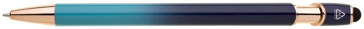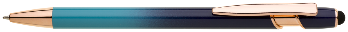 Elegantní kuličkové pero s kovovým tělem v moderním modro-tyrkysovém přechodu a detaily z růžového zlata. Na konci má dotykovou část pro ovládání mobilu či tabletu. Výsledný efekt laserového značení je světle stříbrný až bílý. Náplň X-20 modře píšící.