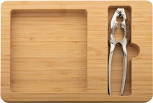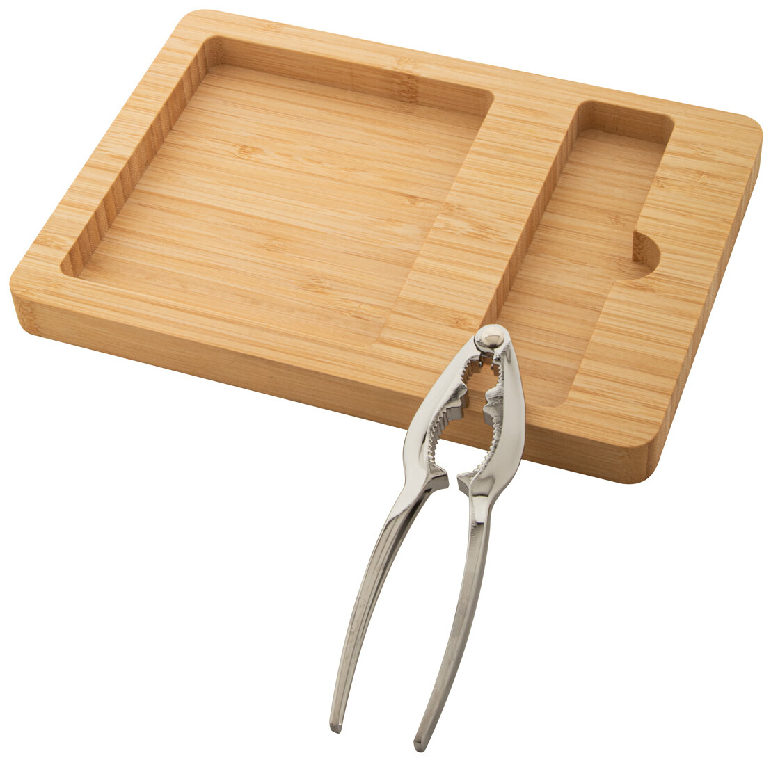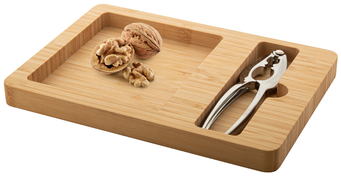 Sada na louskání ořechů s bambusovým tácem a kovovým louskáčkem. V kraftové papírové krabici.