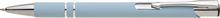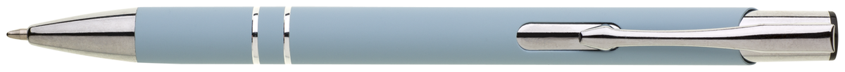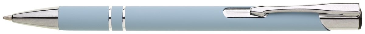 Hliníková propiska se stříbrnými doplňky a měkkým pogumovaným soft povrchemve ve světle modré barvě. Modře píšící.