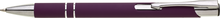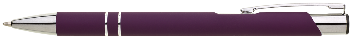 Hliníková propiska se stříbrnými doplňky a měkkým pogumovaným soft povrchem ve fialové barvě. Modře píšící.