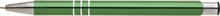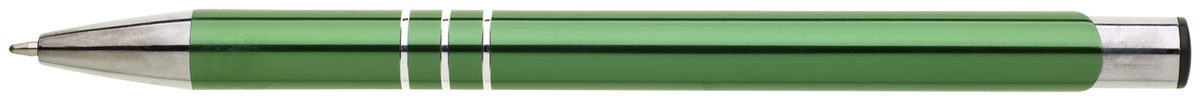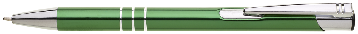 TRIALI hliníková reklamní tužka. Lesklé zelené tělo se třemi stříbrnými proužky a chromovými doplňky.