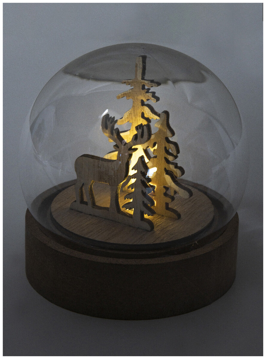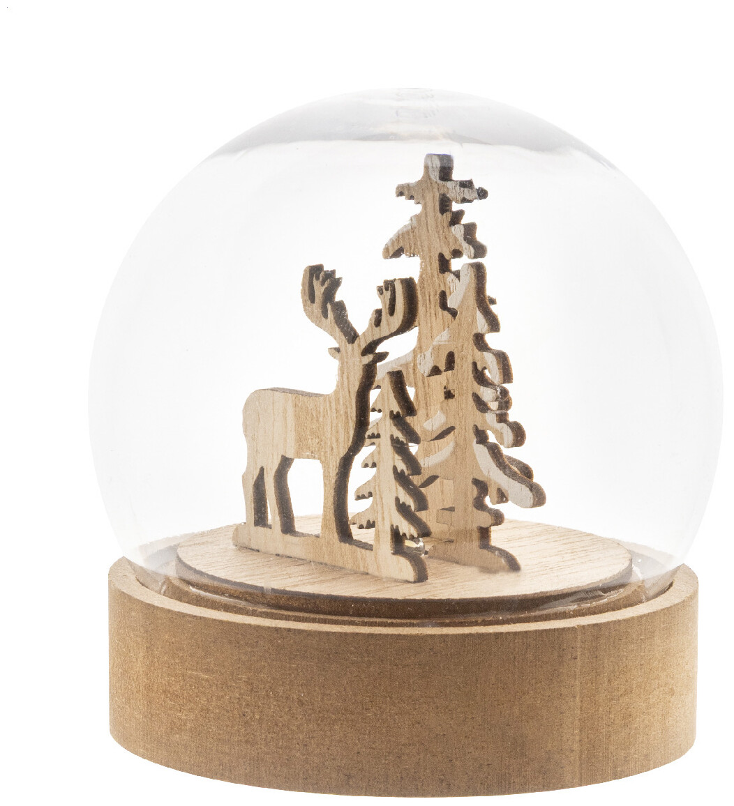 Vánoční dekorace ve tvaru sněhové koule, osvětlená, na dřevěném podstavci z MDF s LED světlem. Včetně knoflíkových baterií. S tlačítkem ZAP/VYP na podstavci.