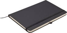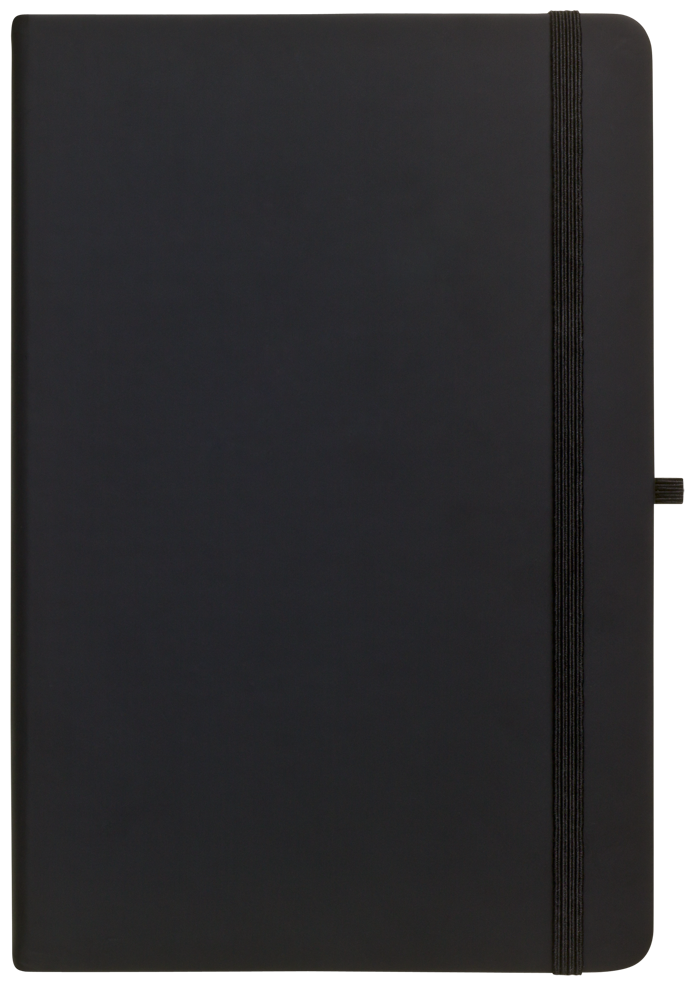 Zápisník A5 v černých deskách z PU materiálu má 80 linkovaných listů. Blok má uzavírací gumičku, poutko na propisku a textilní záložku v barvě desek.