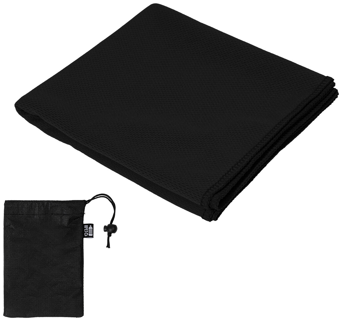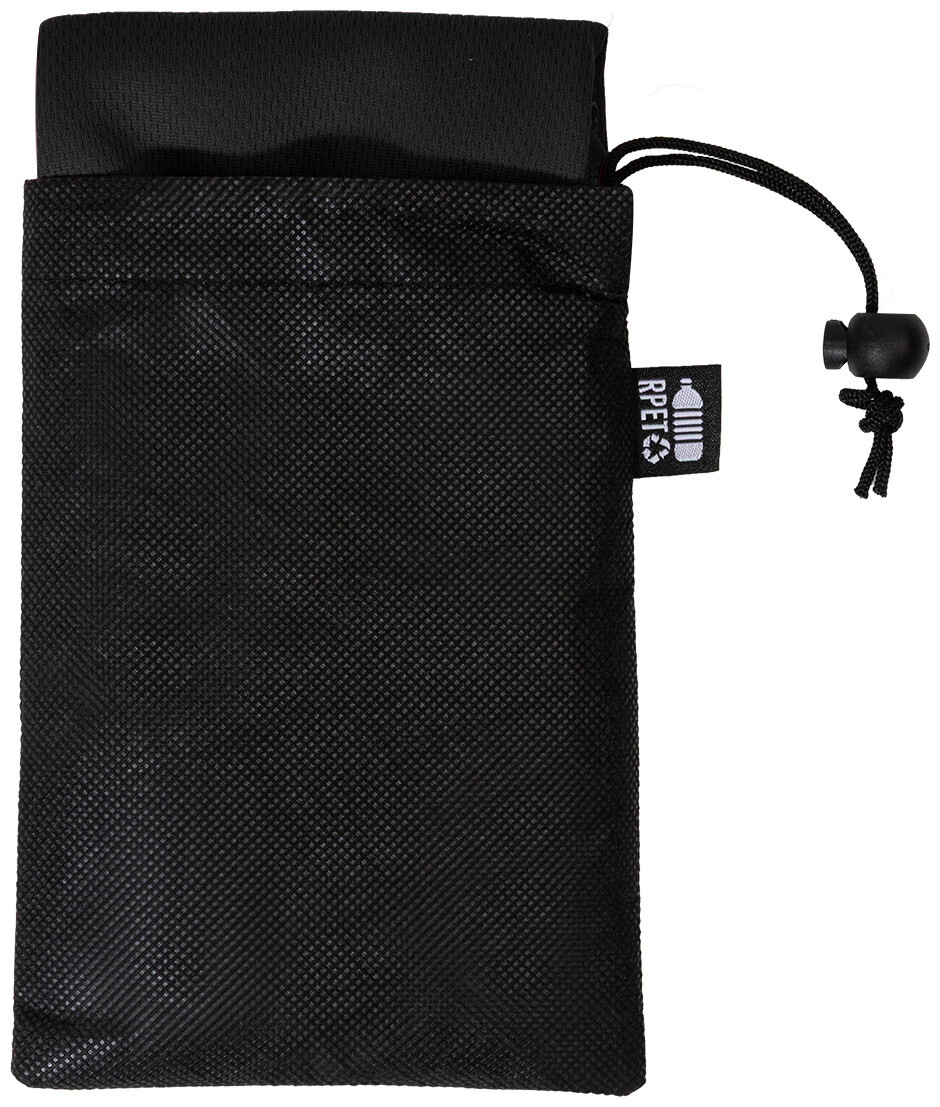 Sportovní ručník z mikrovlákna RPET v přepravním pouzdře z netkané tkaniny RPET s charakteristickou etiketou RPET. Polyester RPET, 140 g/m2.