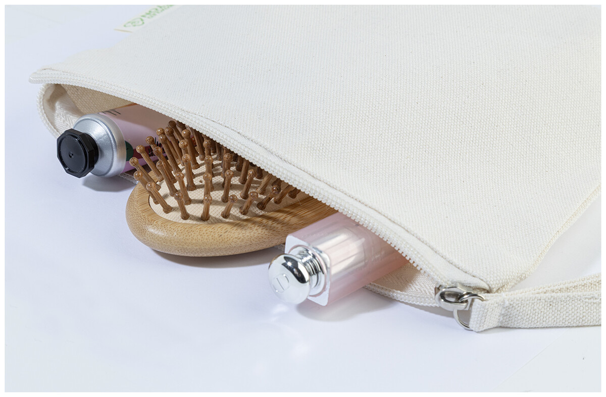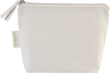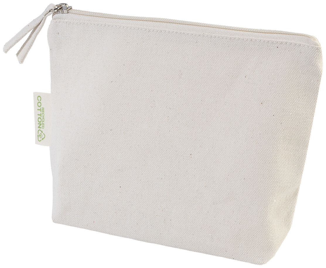 Kosmetická taštička na zip ze 70 % recyklované bavlny a 30 % RPET polyesteru, 280 g/m2. S výraznou etiketou o recyklované bavlně.