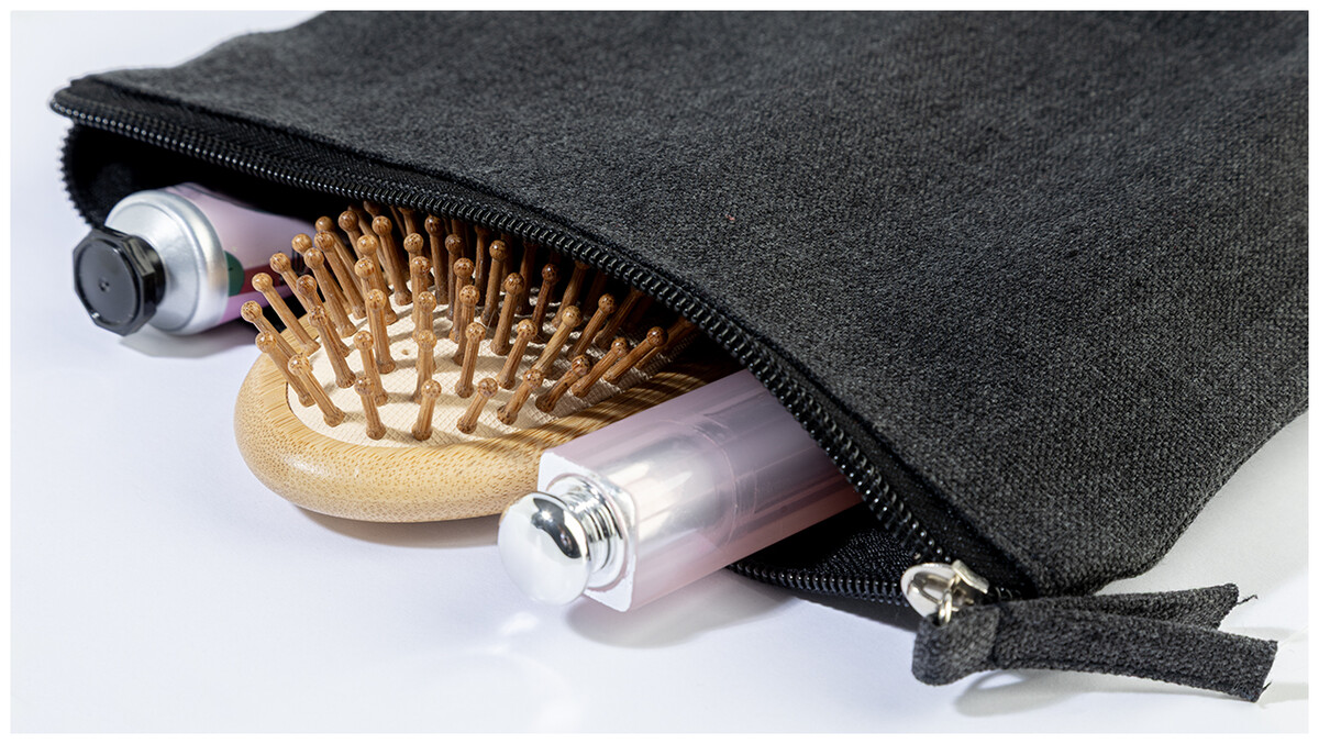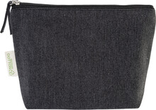Kosmetická taštička na zip ze 70 % recyklované bavlny a 30 % RPET polyesteru, 280 g/m2. S výraznou etiketou o recyklované bavlně.