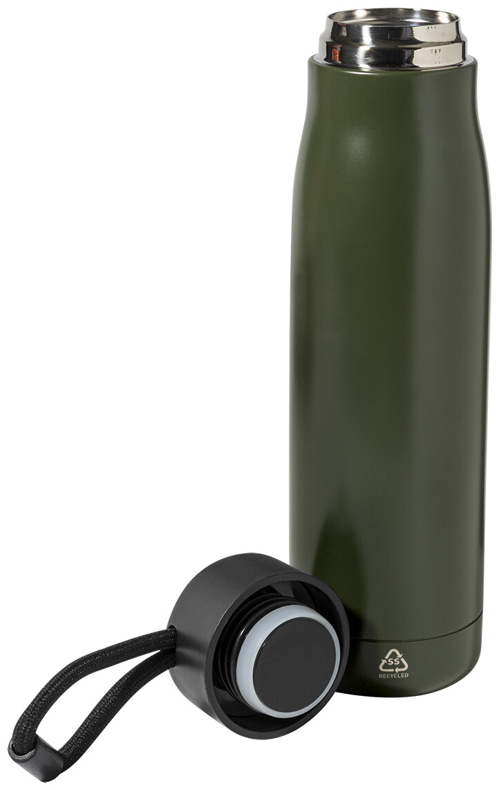 Dvoustěnná, vakuově izolovaná láhev z recyklované nerezové oceli s PP víčkem a integrovaným poutkem na nošení se šňůrkou. 500 ml.