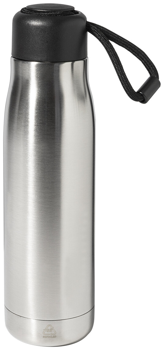 Dvoustěnná, vakuově izolovaná láhev z recyklované nerezové oceli s PP víčkem a integrovaným poutkem na nošení se šňůrkou. 500 ml.
