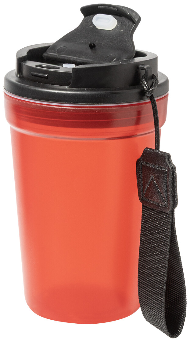 Jednostěnný cestovní kelímek z PP plastu s matnou povrchovou úpravou, víčkem na pití a poutkem z RPET polyesteru. 400 ml.