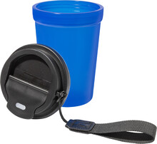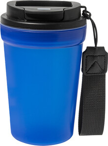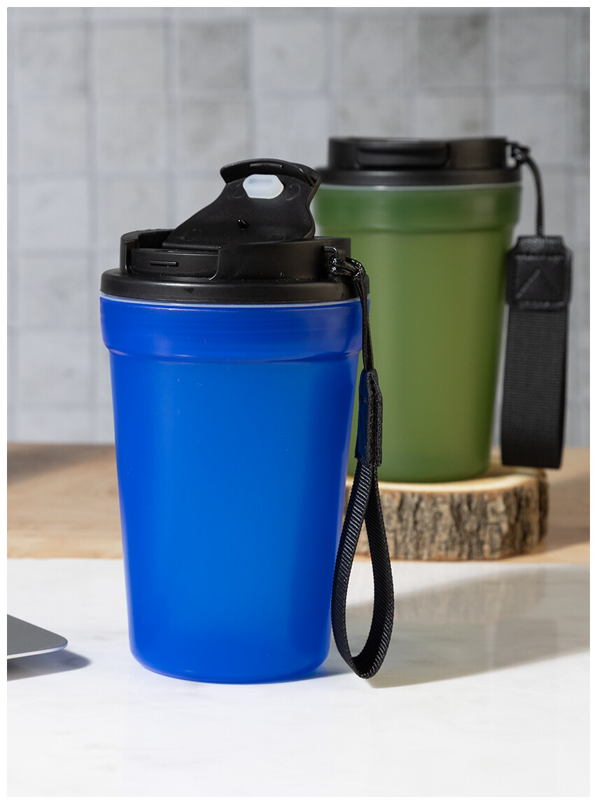 Jednostěnný cestovní kelímek z PP plastu s matnou povrchovou úpravou, víčkem na pití a poutkem z RPET polyesteru. 400 ml.