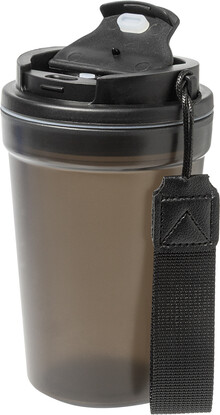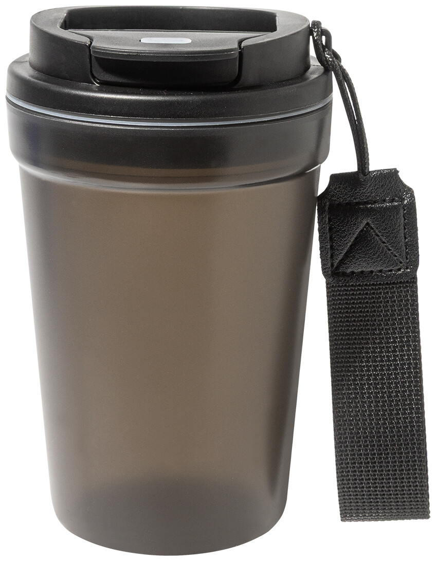 Jednostěnný cestovní kelímek z PP plastu s matnou povrchovou úpravou, víčkem na pití a poutkem z RPET polyesteru. 400 ml.