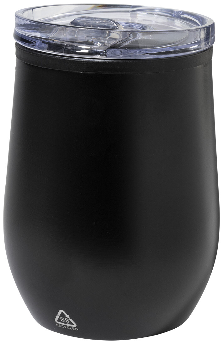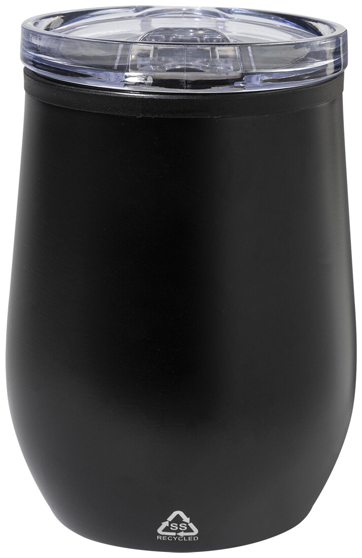 Dvoustěnný termo hrnek z recyklované nerezové oceli s vnitřní stranou z PP a víčkem z PS. 350 ml.