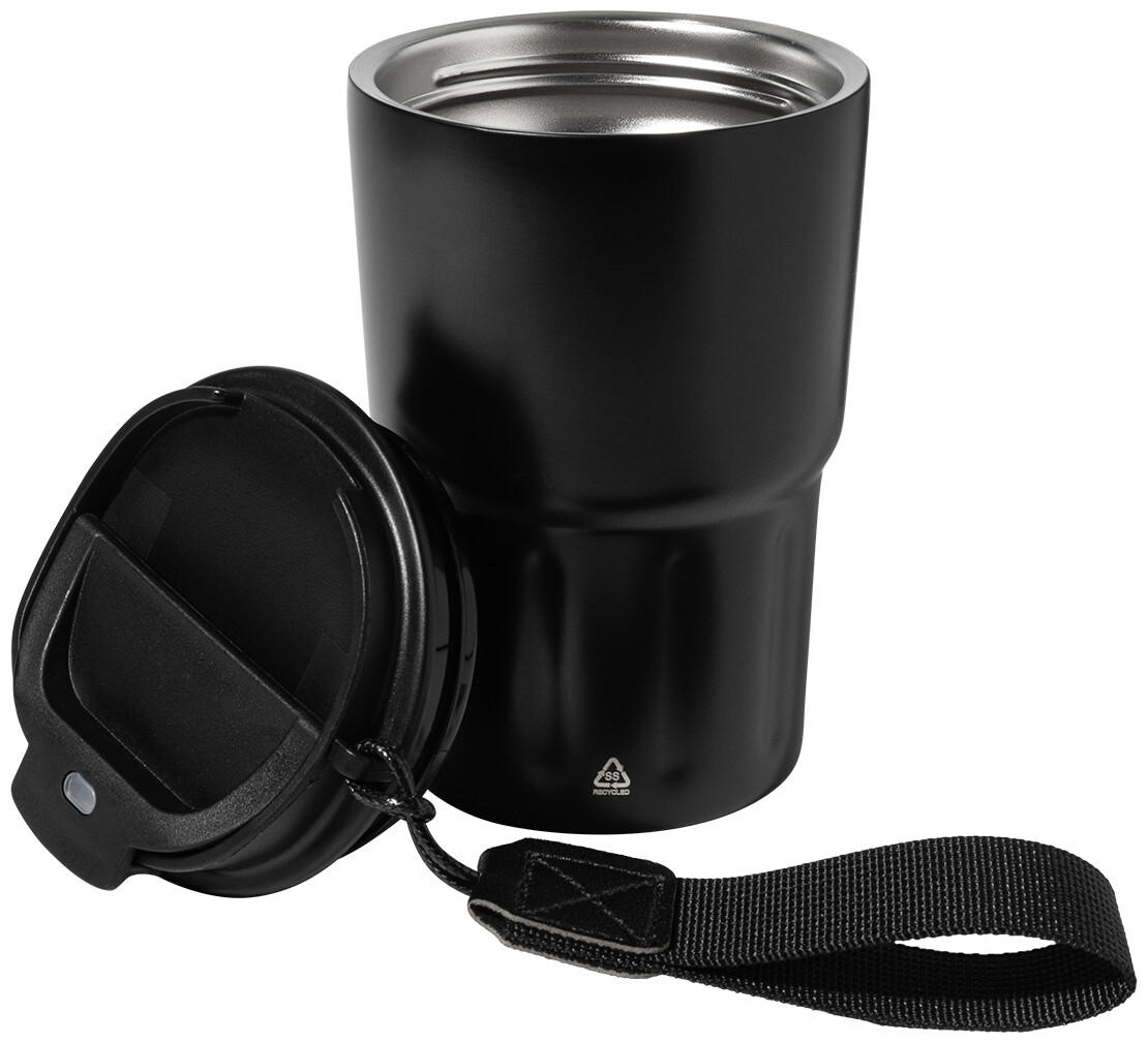 Dvoustěnný termo hrnek z recyklované nerezové oceli s izolačním víčkem z PP. S poutkem z RPET polyesteru. 350 ml.