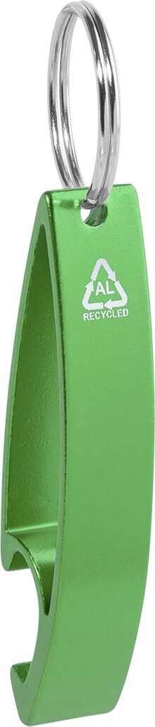 Otvírák na lahve z recyklovaného hliníku s kovovým kroužkem na klíče.