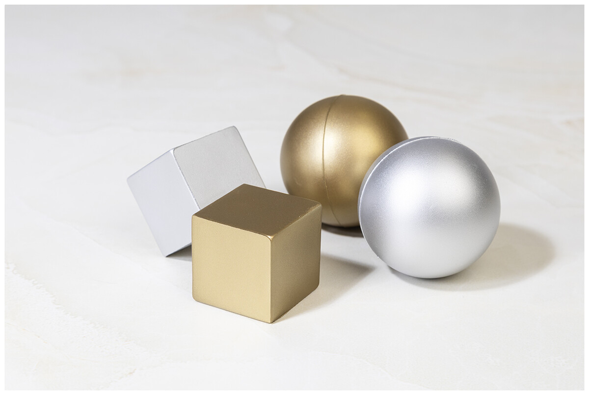Antistres ve tvaru kostky z PU pěny s metalickým povrchem.