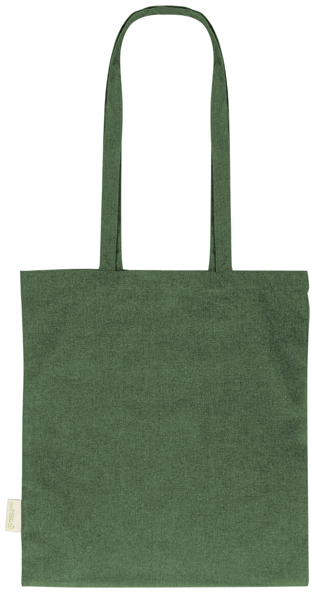 Nákupní taška s dlouhými uchy ze 70 % recyklované bavlny a 30 % RPET polyesteru, 140 g/m2. S výraznou etiketou o recyklované bavlně.