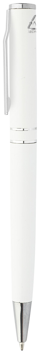 Kuličkové pero z recyklovaného hliníku s chromovanými částmi a kroužky. V černé dárkové krabičce. S modrou náplní.