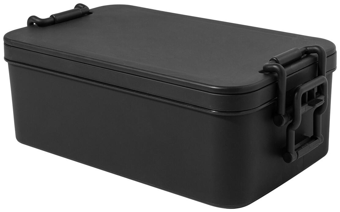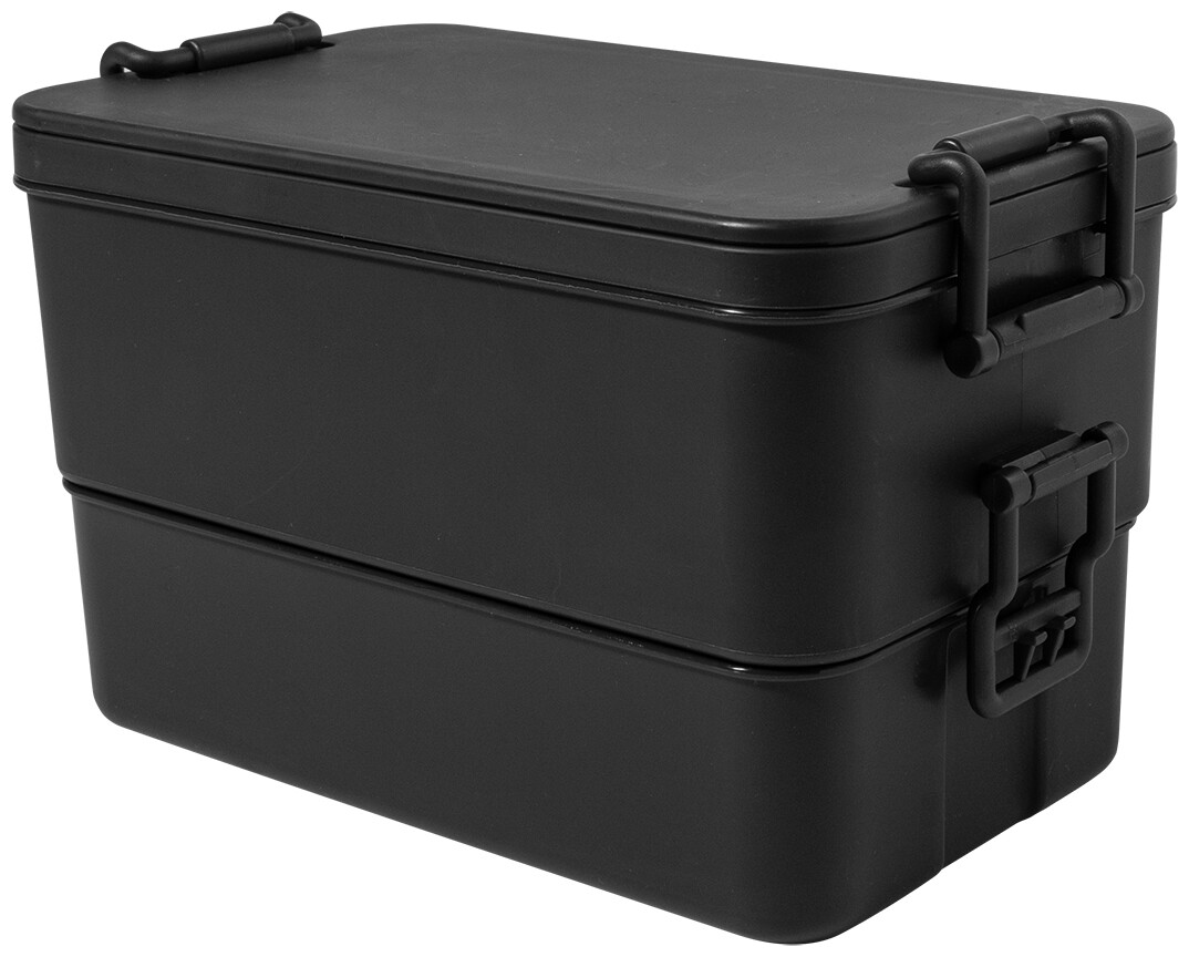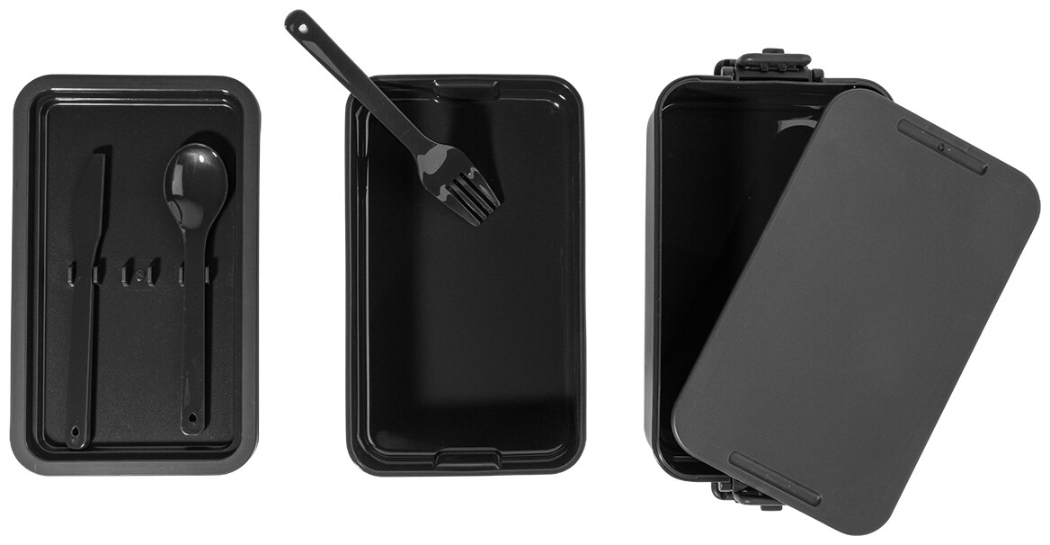 Box na jídlo z PP plastu se sadou příborů (vidlička, lžíce a nůž), zapínáním na přezku a 2 přihrádkami (1000 ml a 800 ml). Stohovatelný design pro kompaktní skladování.
