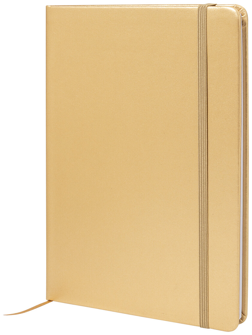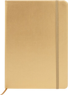Blok A5 s potahem z recyklované PU kůže s metalickou úpravou se 100 linkovanými listy z recyklovaného papíru. S barevnou záložkou a gumičkou.