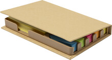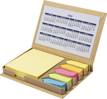 Samolepicí blok z recyklovaného papíru se 100 žlutými papírky na poznámky a 500 záložkami (v 5 barvách). Včetně kalendáře na 4 roky na vnitřní straně víka.