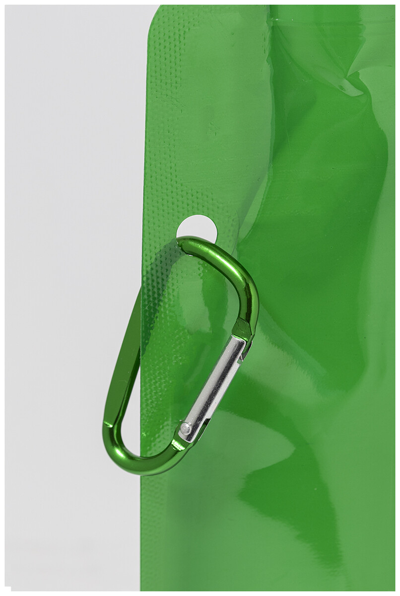 Skládací sportovní láhev z RPET s víčkem na pití a hliníkovou karabinou, 500 ml. Bez BPA. Nevhodná pro sycené nápoje.