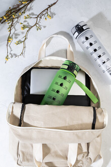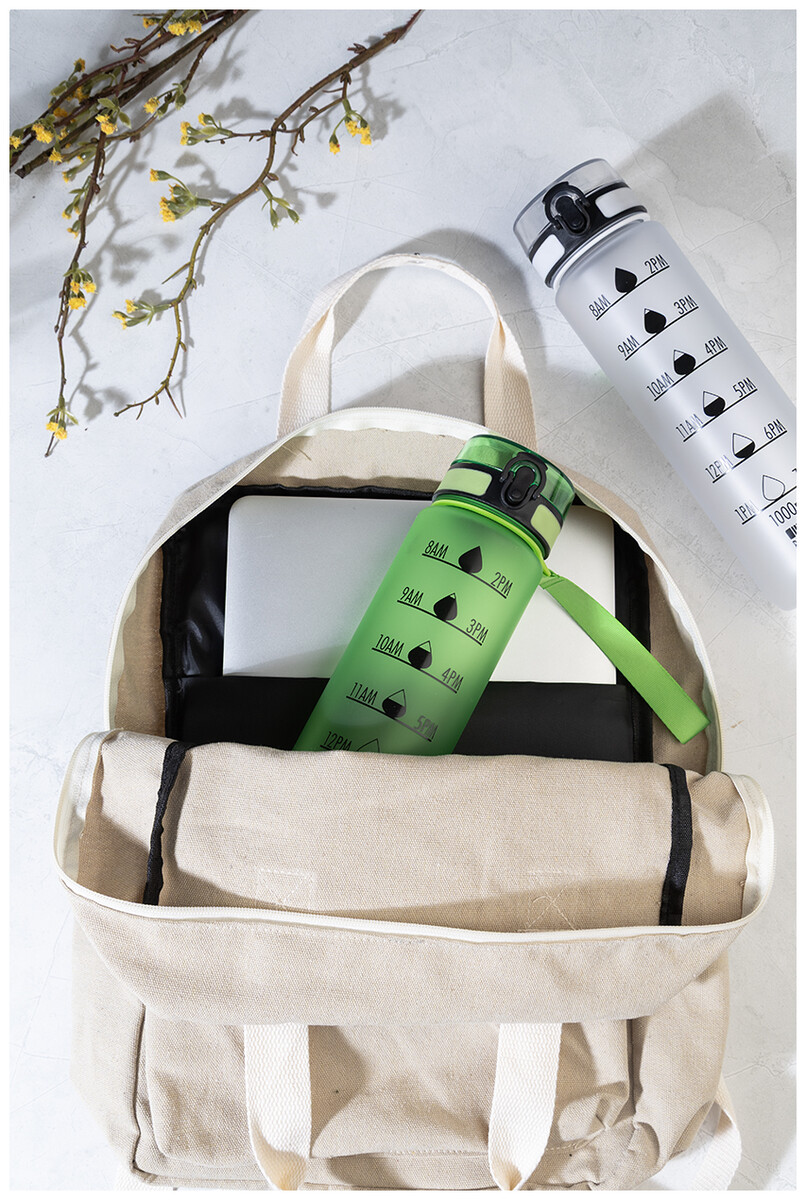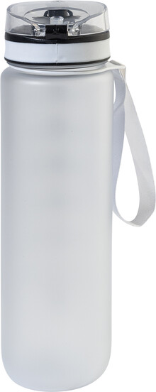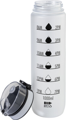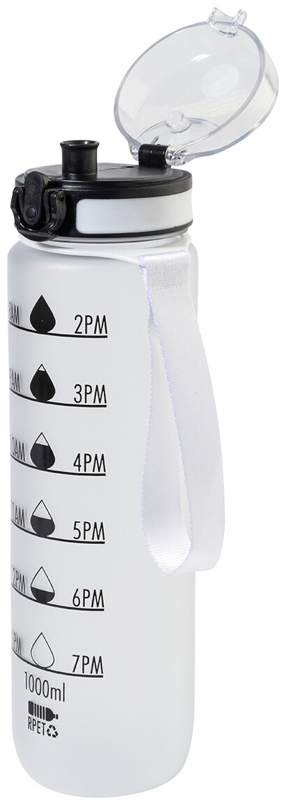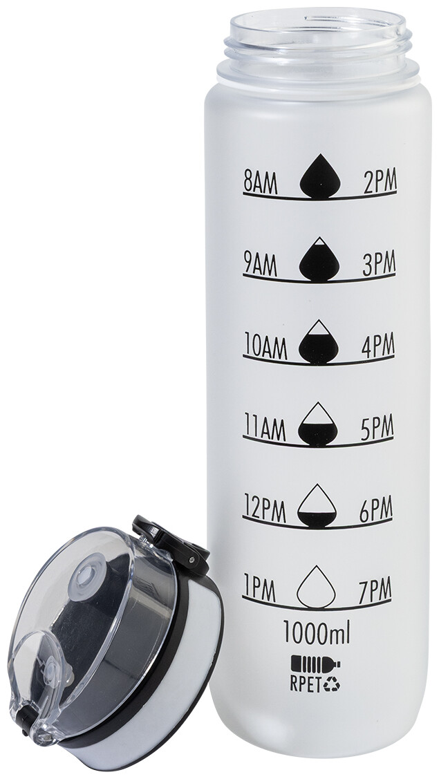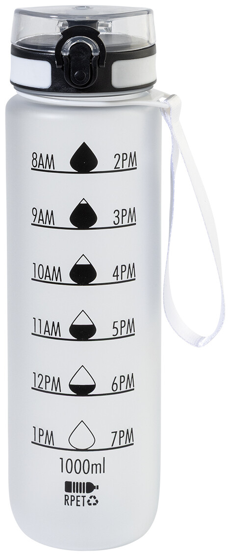 Sportovní láhev z matného RPET s motivačním objemovým a časovým značením, s automaticky otevíratelným odklápěcím víčkem s bezpečnostním zámkem a poutkem na nošení. 1000 ml. Bez BPA. Nevhodné pro sycené nápoje.