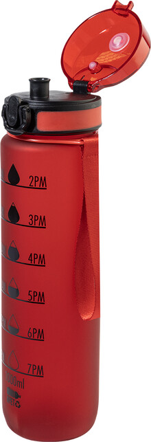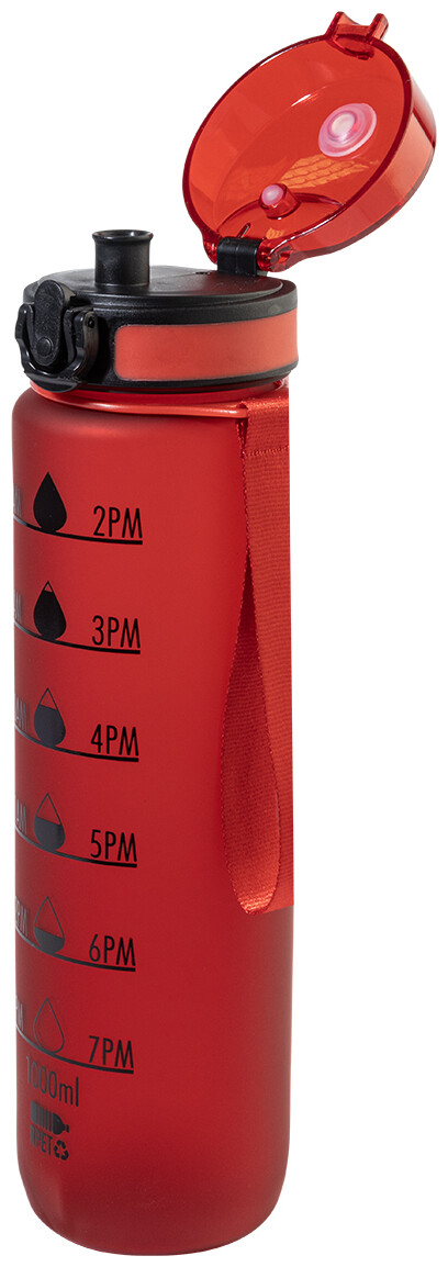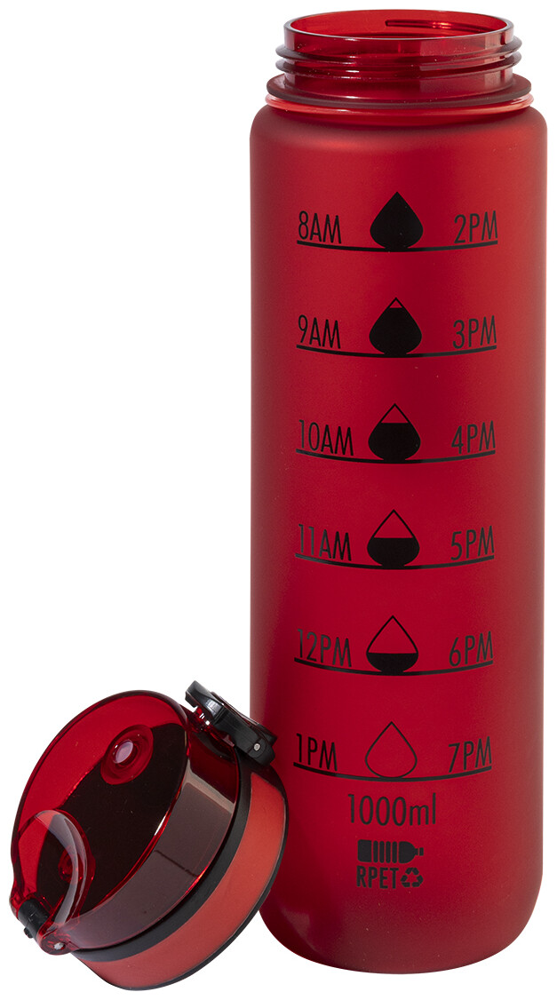 Sportovní láhev z matného RPET s motivačním objemovým a časovým značením, s automaticky otevíratelným odklápěcím víčkem s bezpečnostním zámkem a poutkem na nošení. 1000 ml. Bez BPA. Nevhodné pro sycené nápoje.