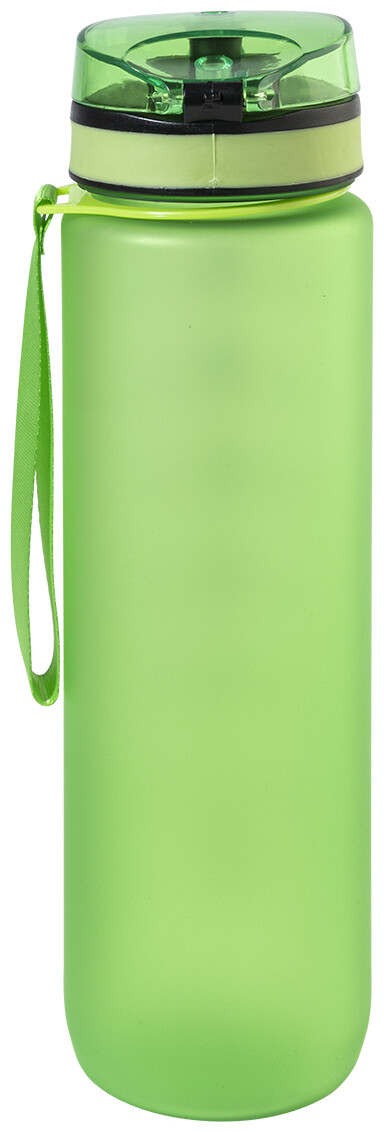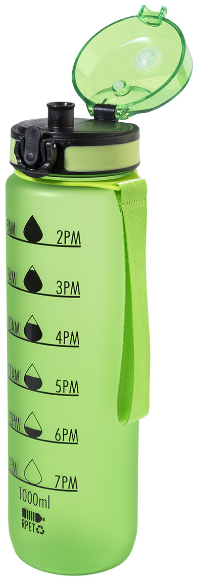 Sportovní láhev z matného RPET s motivačním objemovým a časovým značením, s automaticky otevíratelným odklápěcím víčkem s bezpečnostním zámkem a poutkem na nošení. 1000 ml. Bez BPA. Nevhodné pro sycené nápoje.