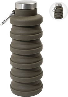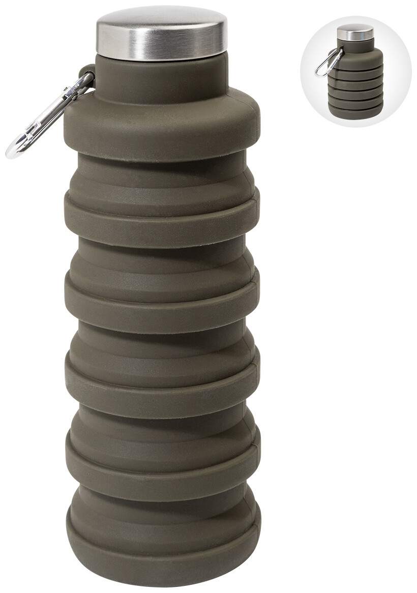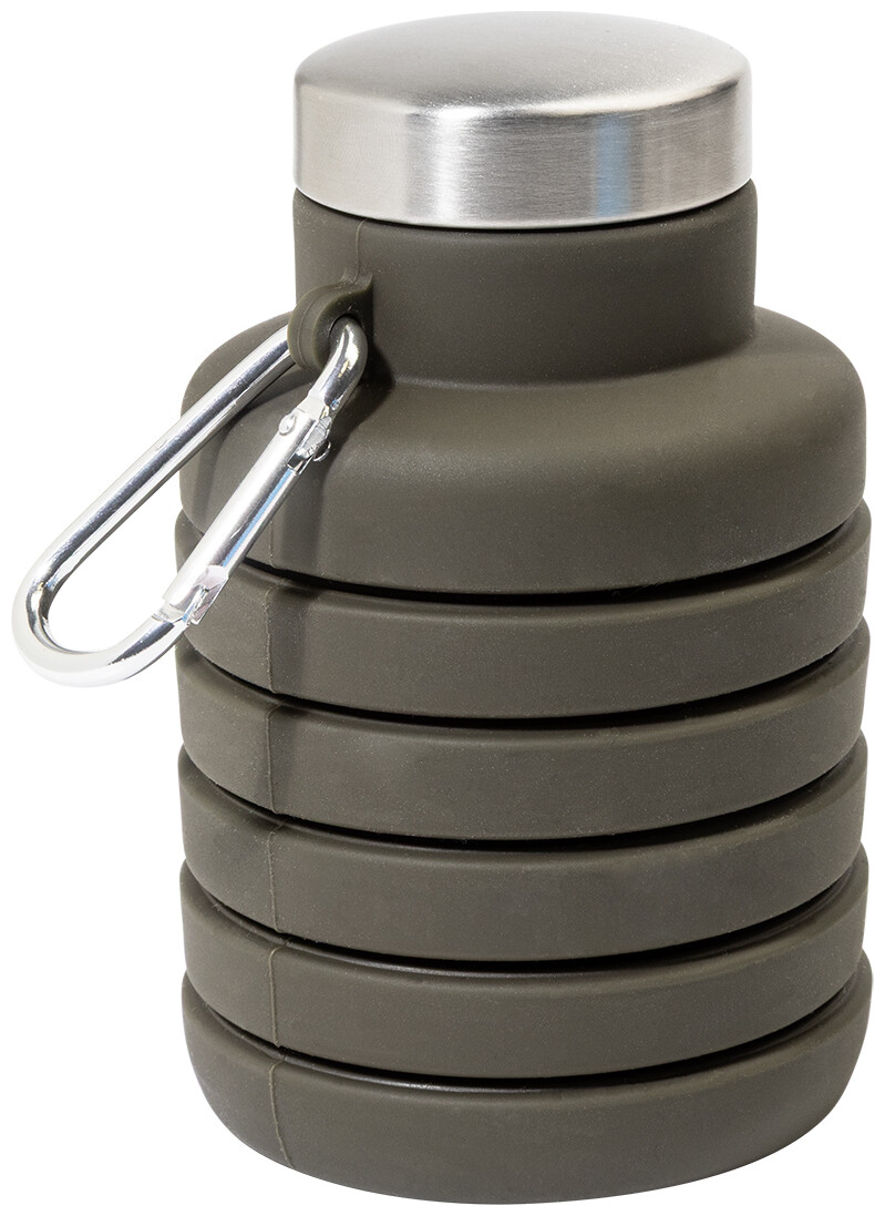 Skládací silikonová láhev s víčkem z nerezové oceli a hliníkovou karabinou. 500 ml