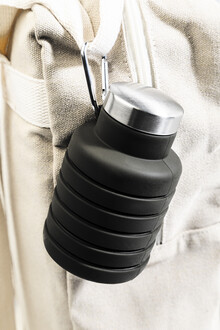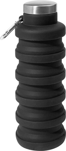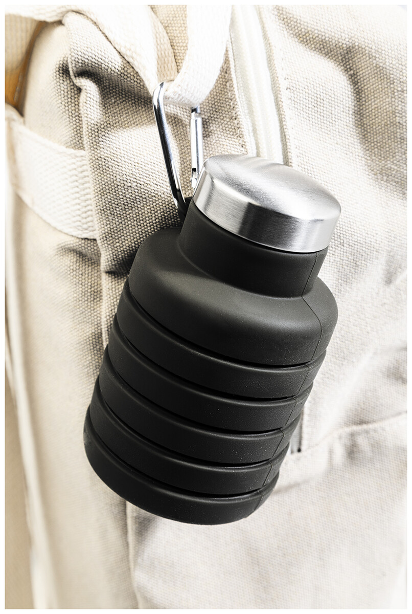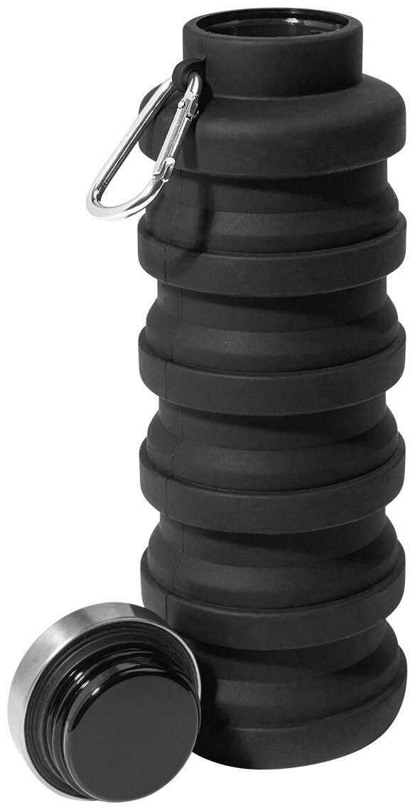 Skládací silikonová láhev s víčkem z nerezové oceli a hliníkovou karabinou. 500 ml