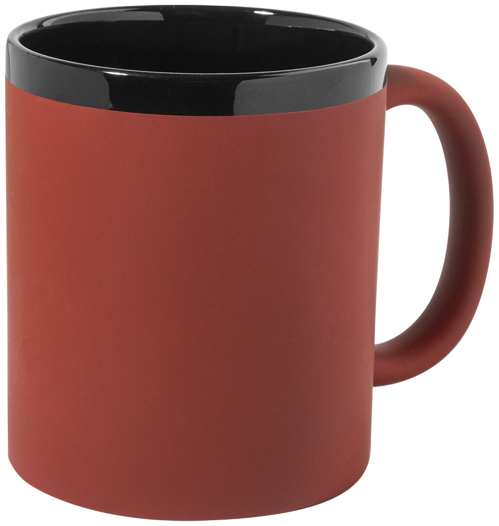 Keramický hrnek s měkkým pogumovaným povrchem a černým vnitřkem a okrajem, 300 ml. Se speciálním povrchem pro gravírování, gravírované logo ladí s barvou na vnitřní straně. V krabičce z kraftového papíru.