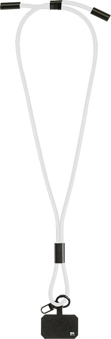 Šňůrka s držákem na mobil z RPET s vložkou pro telefon, karabinou a integrovaným nabíjecím kabelem USB-C na USB-C se skrytými konektory. Podporuje rychlé nabíjení a přenos dat PD 60W.