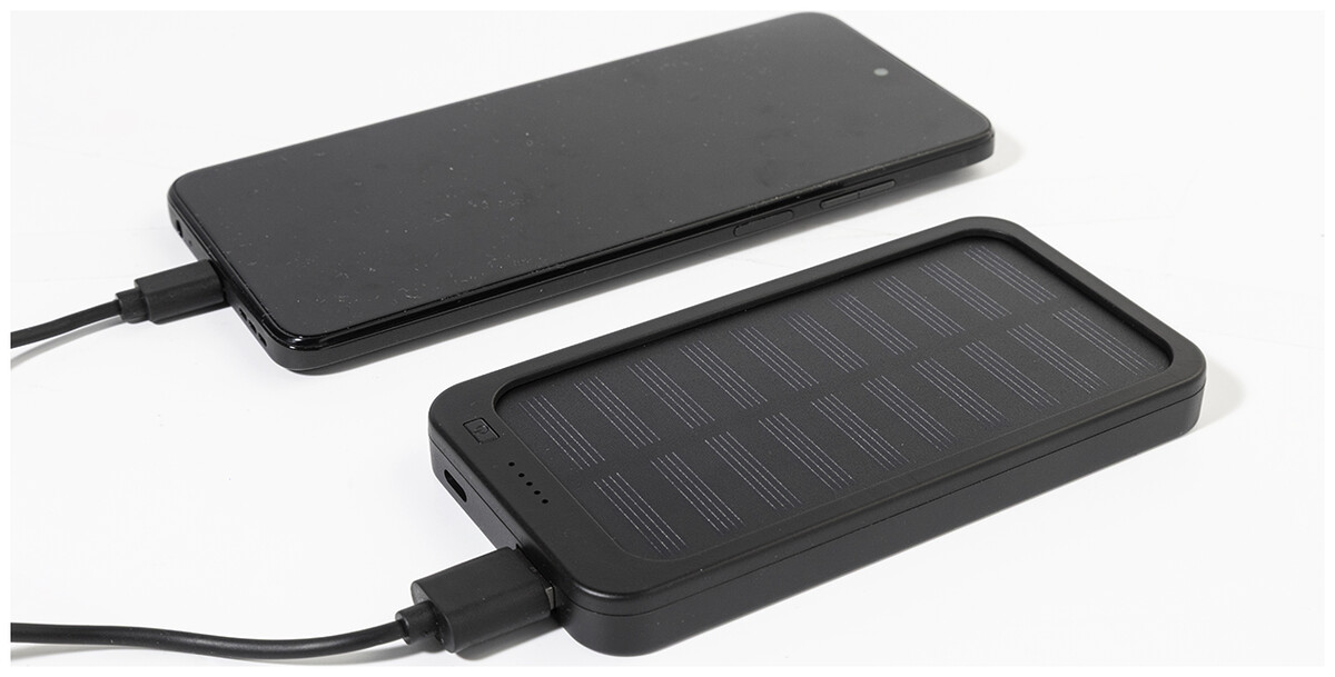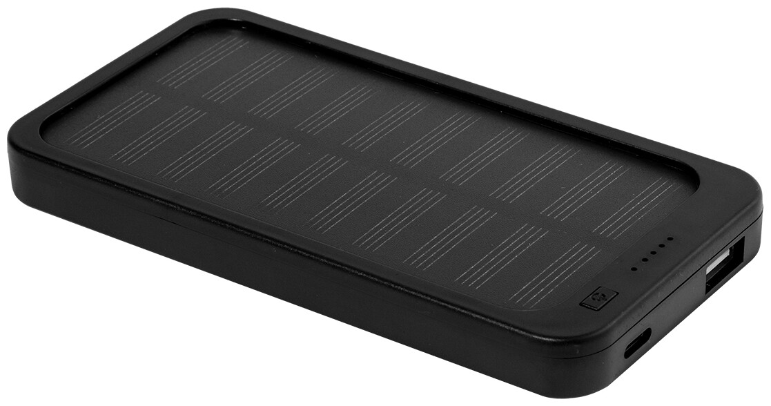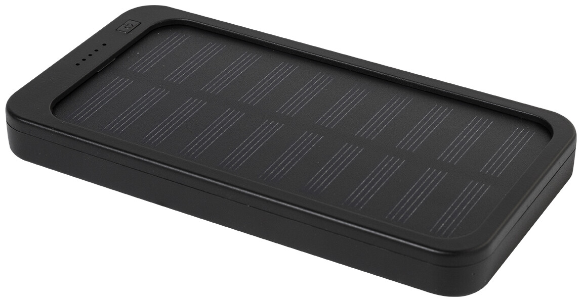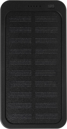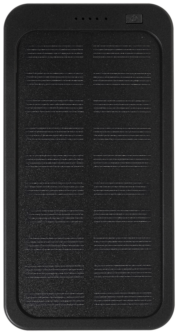 Power banka z recyklovaného ABS plastu s vestavěnou solární nabíječkou a baterií 4000 mAh. S 1 USB a 1 USB-C portem pro nabíjení. Vstupní port USB-C. Včetně nabíjecího kabelu USB.