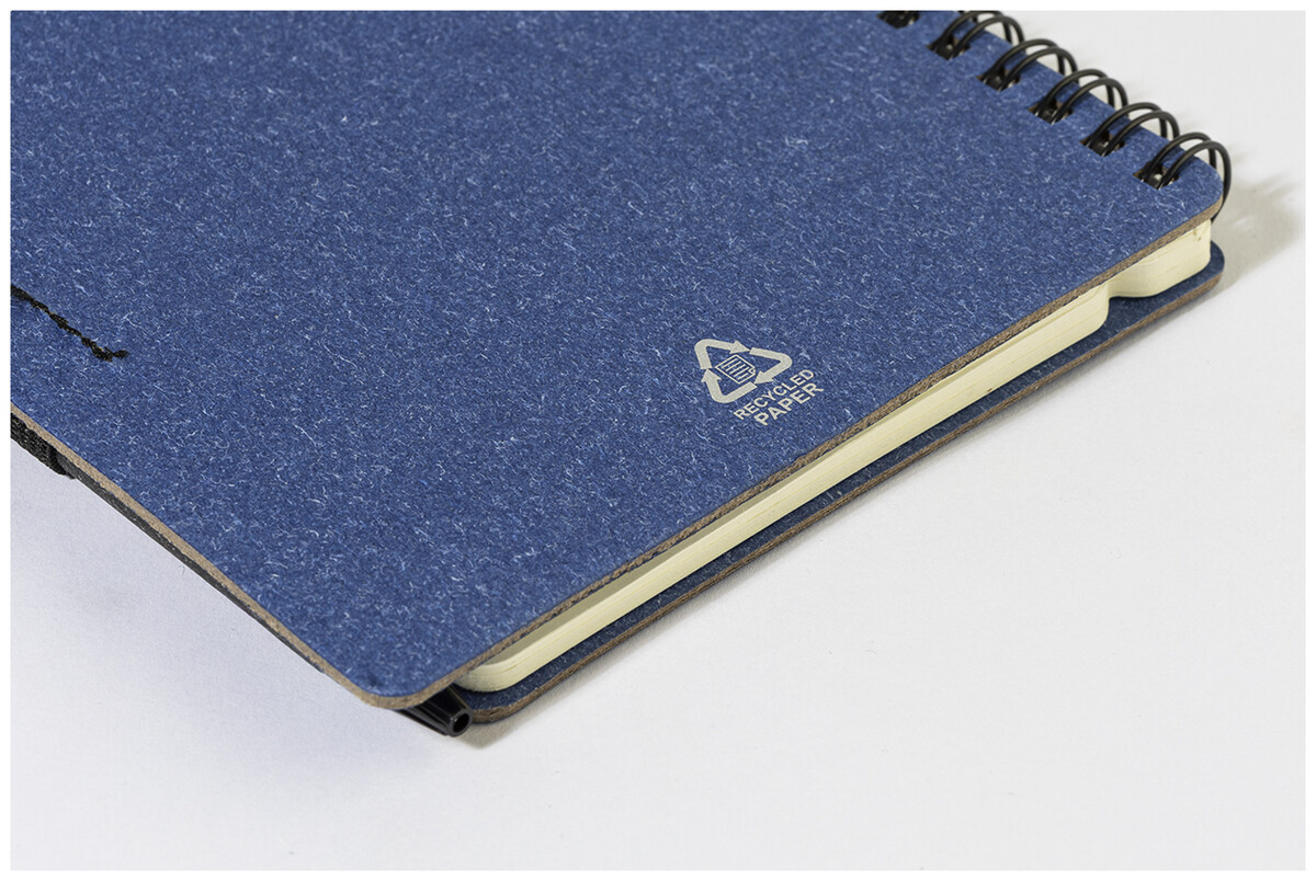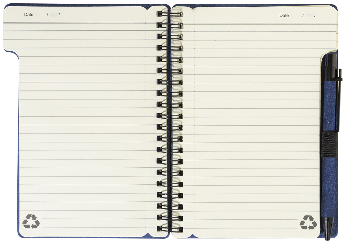 Spirálový blok A6 z recyklovaného papíru s 80 linkovanými listy. Včetně recyklovaného papíru a kuličkového pera z recyklovaného PP s modrou náplní.