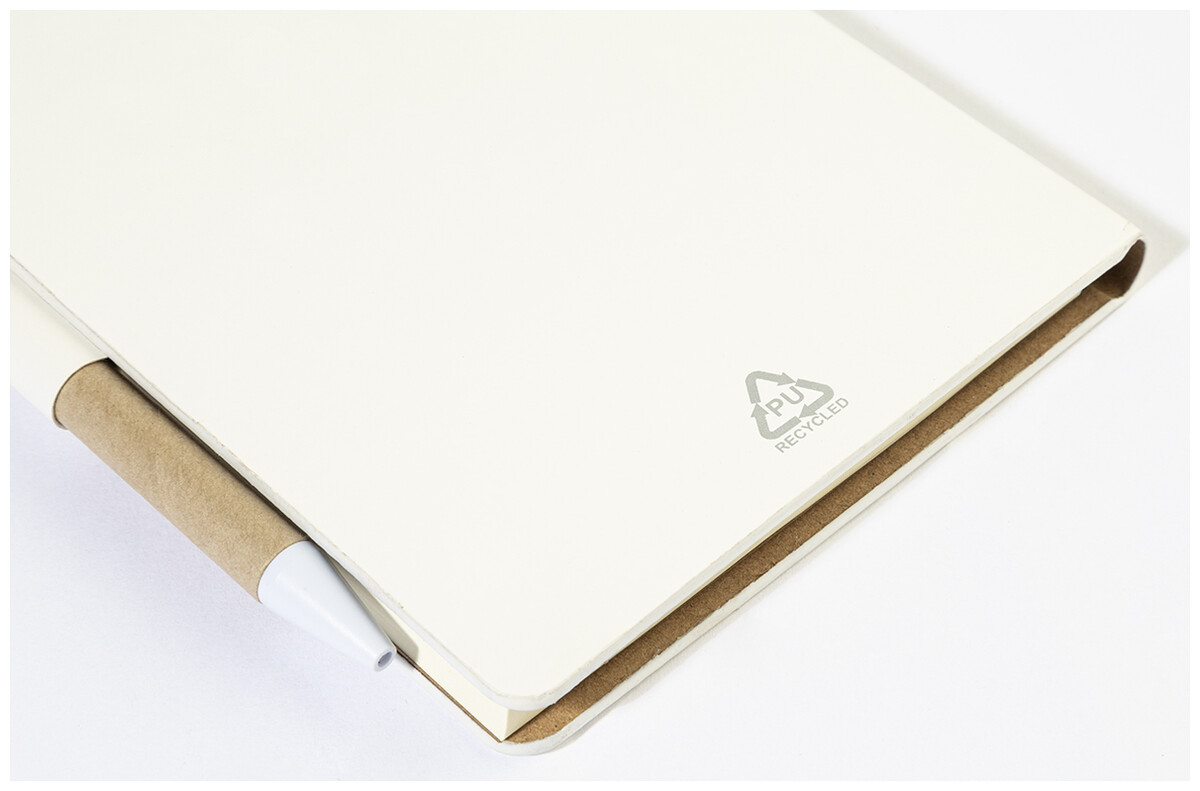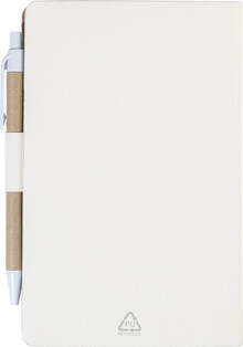 Blok s recyklovanou PU kůží, 70 linkovanými listy z recyklovaného papíru a 125 značkovači stránek (v 5 různých barvách). Včetně recyklovaného papíru a kuličkového pera z recyklovaného PP s modrou náplní.