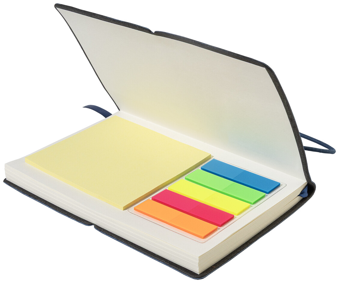 Blok A6 s recyklovanou PU kůží, 70 linkovanými listy z recyklovaného papíru, 25 samolepicími papírky a 125 značkovači stránek (v 5 různých barvách). Se záložkou a horizontálním gumovým páskem.
