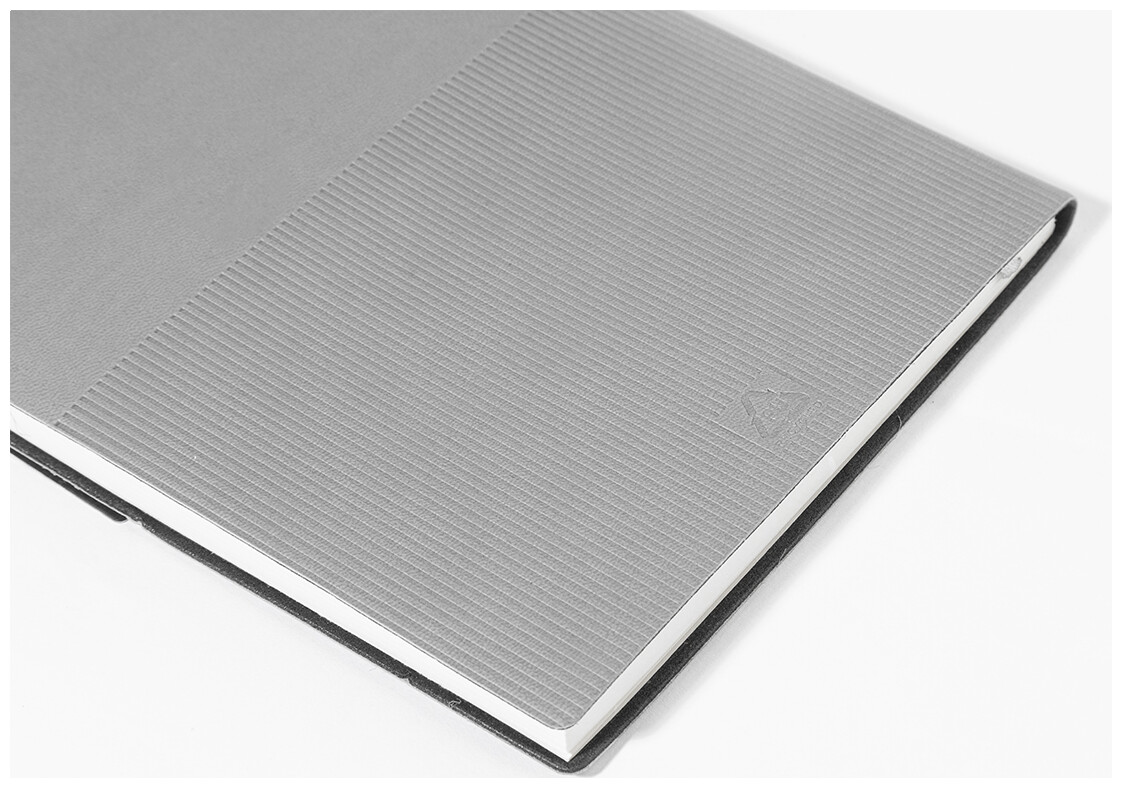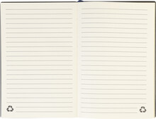 Blok A5 s recyklovanou PU kůží s pruhovanou dekorací a kovovou destičkou pro logo. Se záložkou a 80 linkovanými listy z recyklovaného papíru.