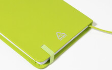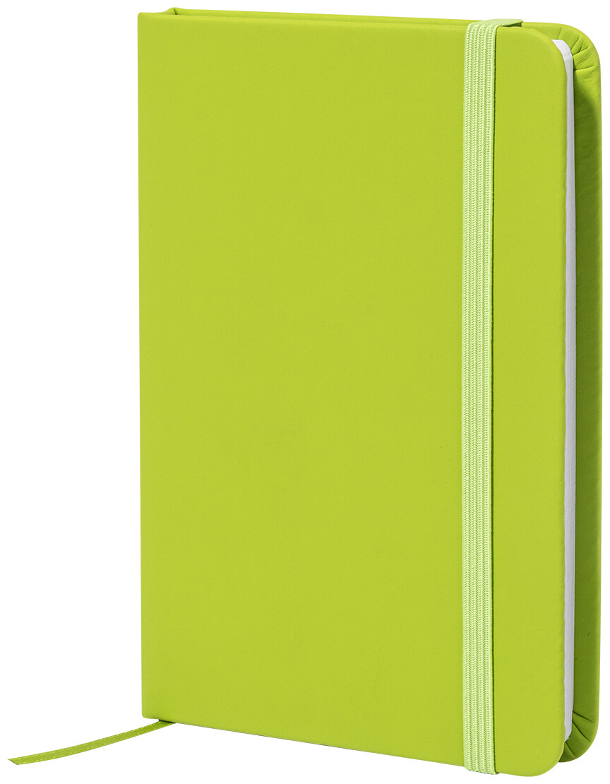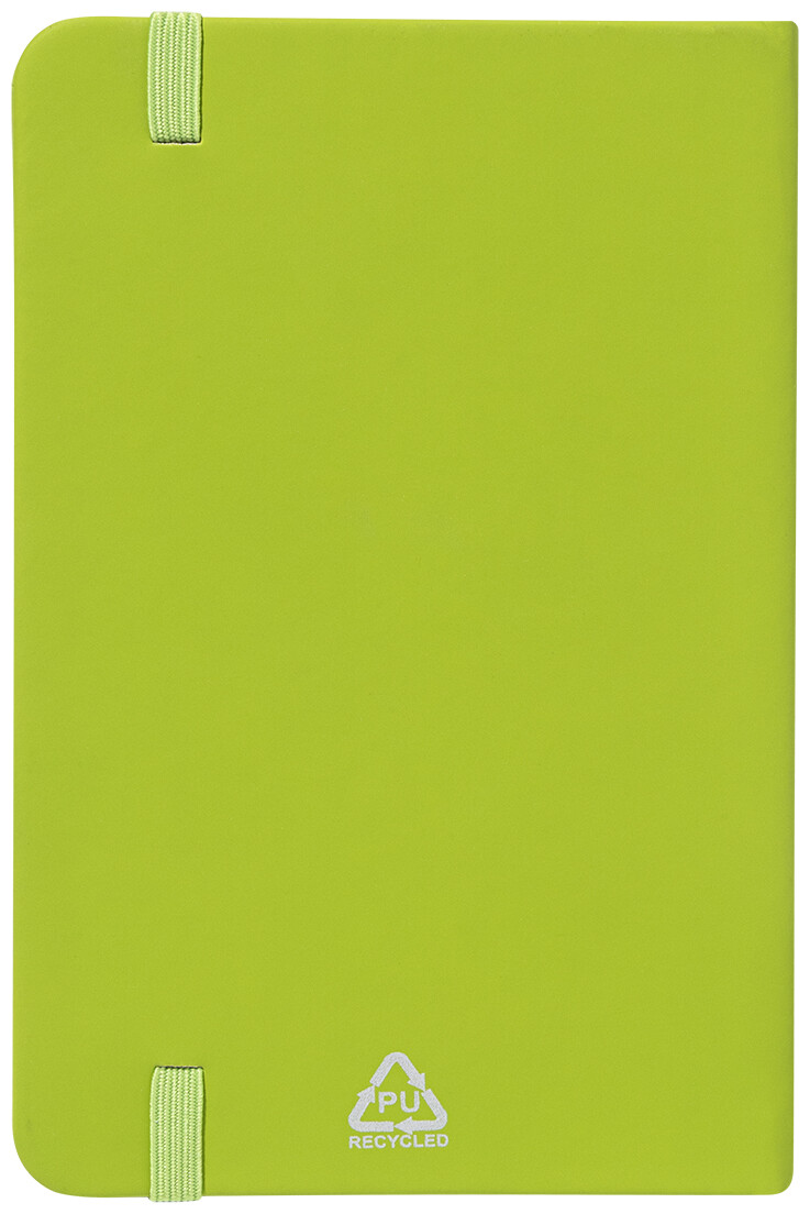 Blok potažený recyklovanou PU kůží se 100 linkovanými listy z recyklovaného papíru. Se záložkou v odpovídající barvě a gumičkou. Velikost A6.