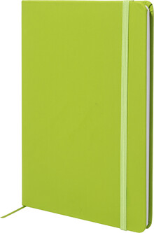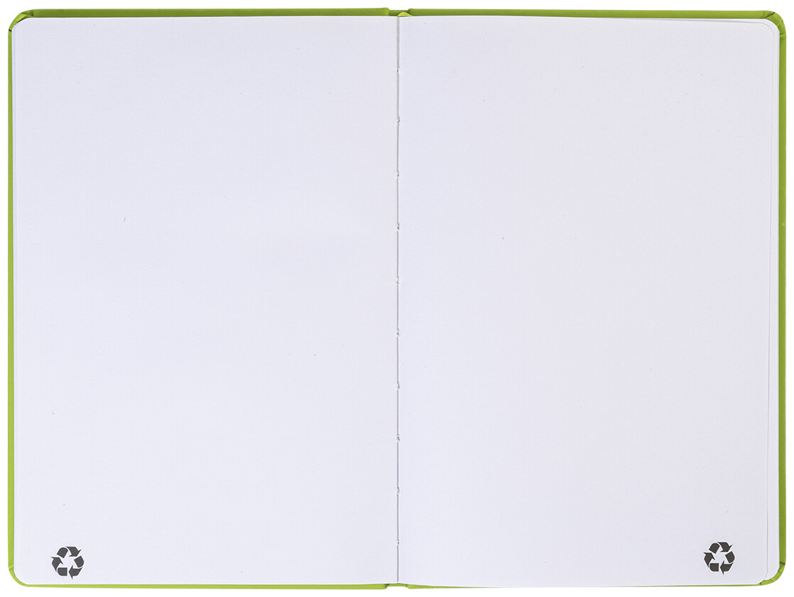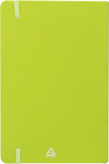 Blok A5 z recyklované PU kůže se 100 čistými listy z recyklovaného papíru. Se záložkou v odpovídající barvě a gumičkou.