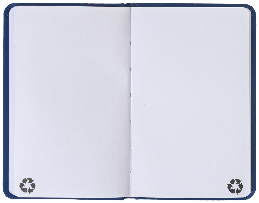 Blok A6 z recyklované PU kůže se 100 čistými listy z recyklovaného papíru. Se záložkou v odpovídající barvě a gumičkou.
