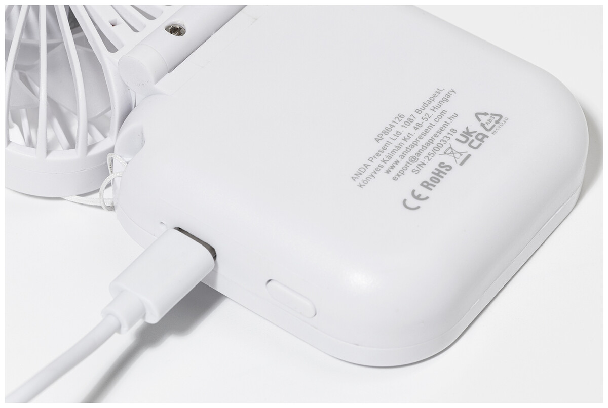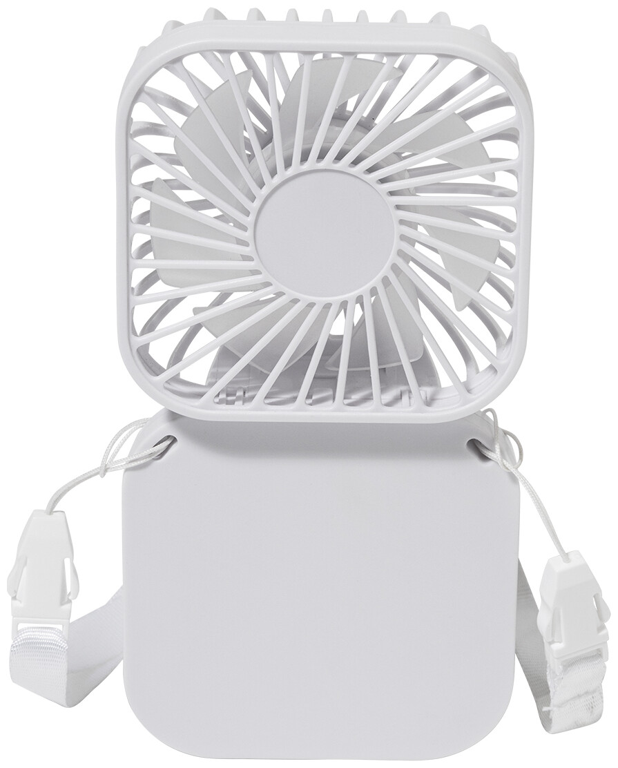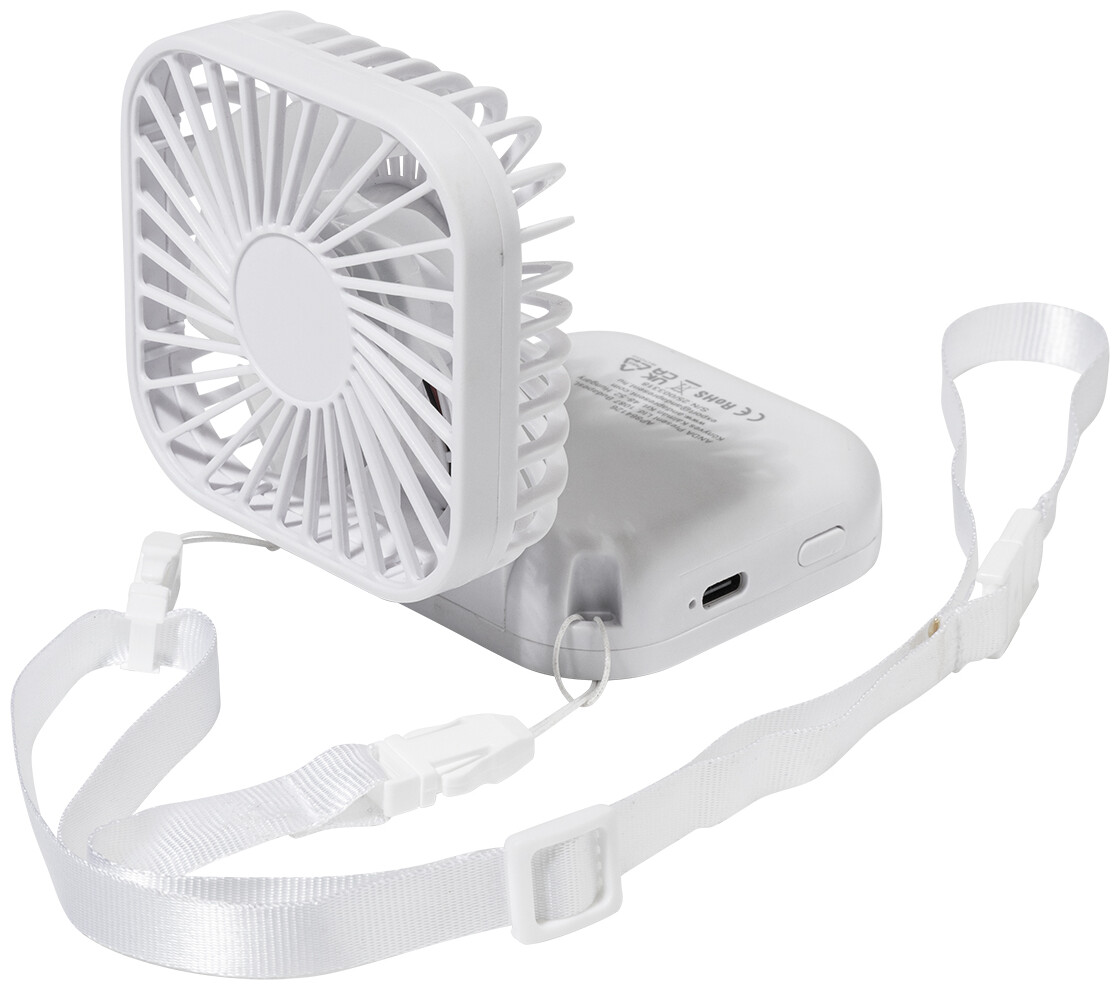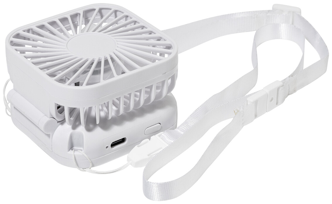 Elektrický ruční větráček z recyklovaného ABS plastu s poutkem na krk a vestavěnou dobíjecí baterií přes USB (500 mAh). S nastavitelným úhlem hlavy a 3 rychlostmi. Včetně USB kabelu pro nabíjení.