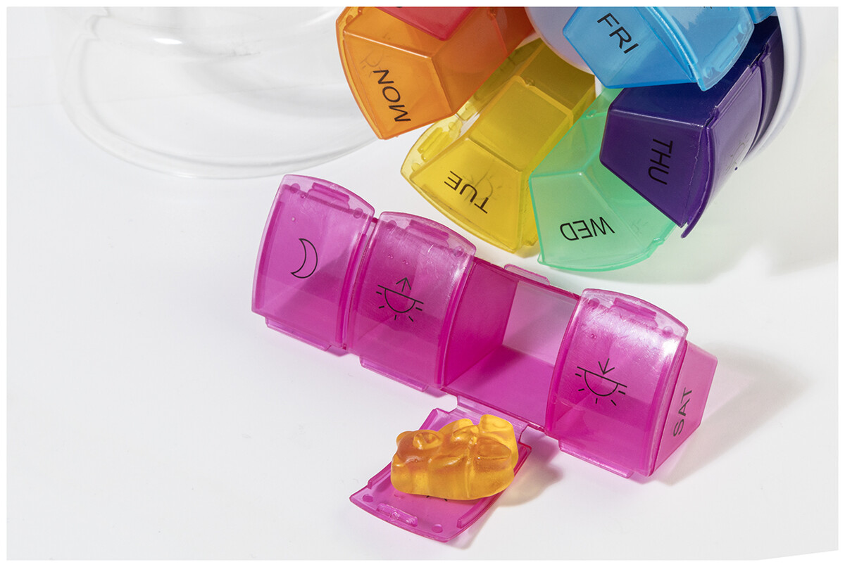 Sada týdenních krabiček na léky z recyklovaného ABS plastu se 7 denními krabičkami, každá se 4 přihrádkami pro různé denní doby. V kulatém stojanu s průhledným víkem.
