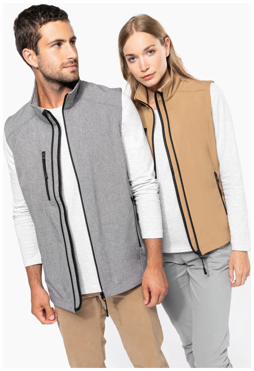 Třívrstvá, prodyšná, větru a voděodolná softshellová vesta na tělo se zipem a náprsními a bočními kapsami na zip. S prodyšnou střední vrstvou a vnitřní vrstvou z micro polar fleecu. Materiál: 95 % polyester a 5 % elastan, 300 g/m2. Výrobek značky Kariban.