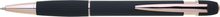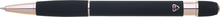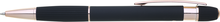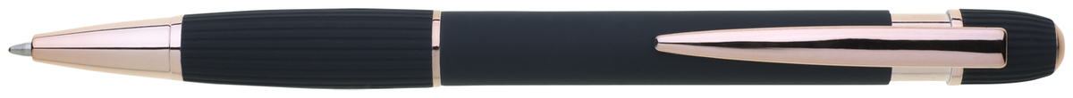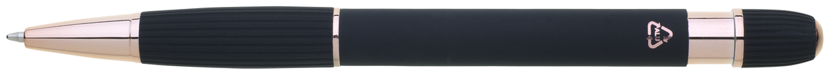 propiska z recyklovaného hliníku se soft povrchem a doplňky v růžovo-zlaté barvě. Laserované logo je lesklé, růžovo-zlaté. Náplň modře píšící. Výsledný efekt laserového značení je lesklý, v barvě doplňků.