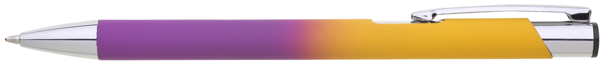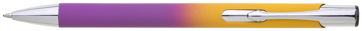 Hliníková propiska se stříbrnými doplňky a měkkým pogumovaným soft povrchem ve fialkovo–tmavě žlutém přechodu. Náplň velkoobsahová, modře píšící.