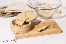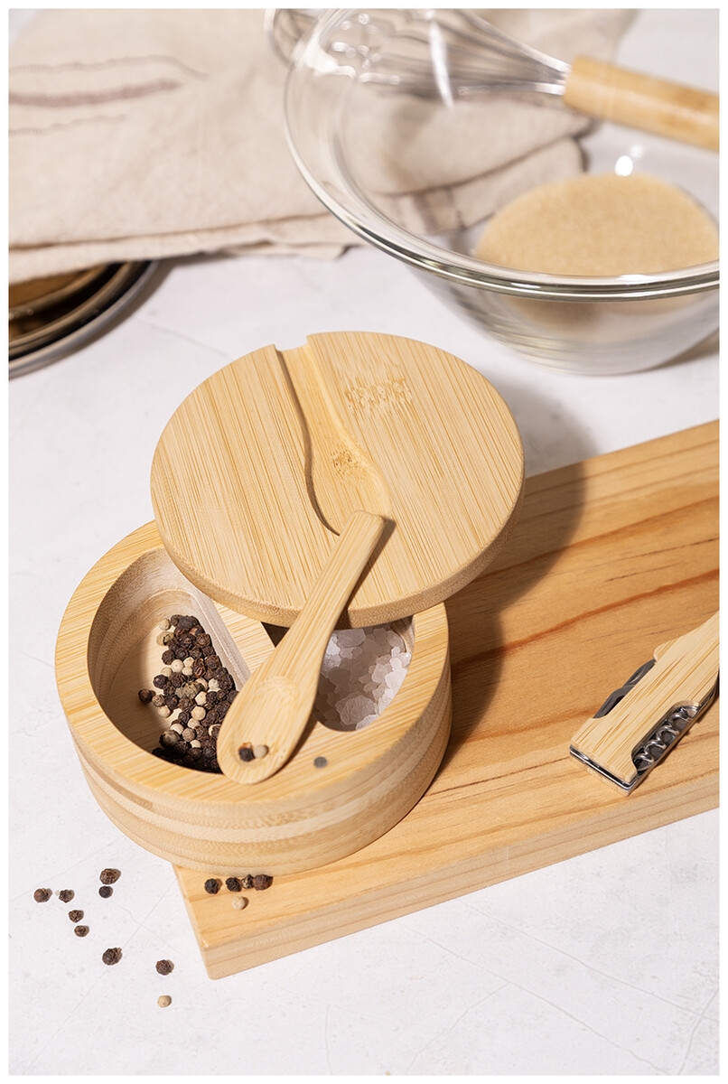 Bambusová slánka a pepřenka se dvěma přihrádkami a magnetickým otočným víkem. Včetně vestavěné servírovací lžíce.